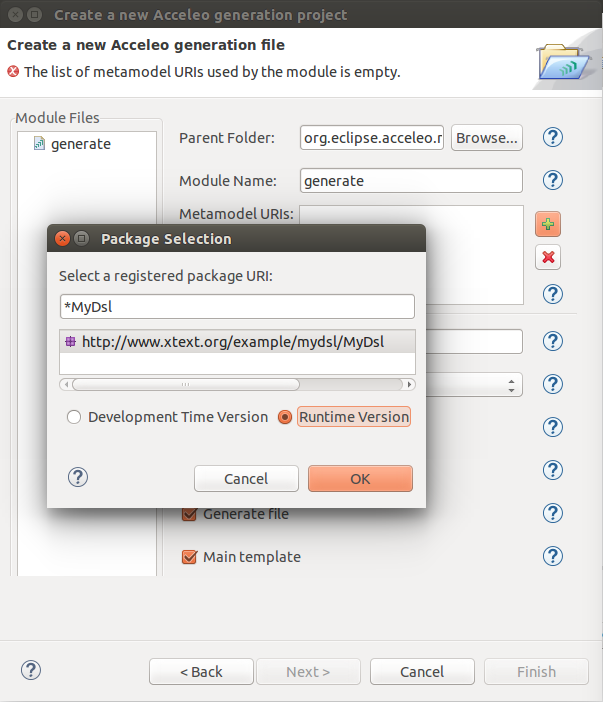 Vous pouvez conserver les valeurs par défaut dans la première page du dialogue de création de projet. Sur la deuxième page, ajoutez le métamodèle de votre DSML, et cochez la case Main template.