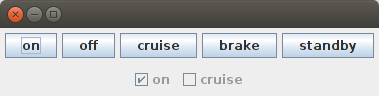 cruise inputs: on off cruise brake standby outputs: on=true cruise=false rules: [] off -> on=false cruise=false [!on] on -> on=true cruise=false [on] cruise -> cruise=true [cruise] brake -> cruise=false [cruise] standby -> cruise=false