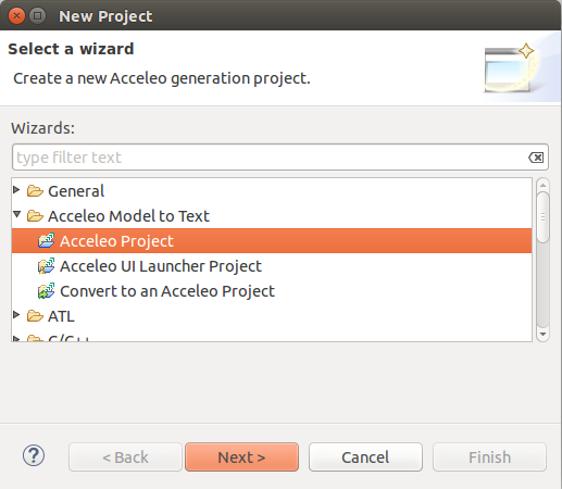 Dans la même instance d'Eclipse que celle où vous avez défini votre DSL, créez un projet Acceleo (ne le faites pas dans l'instance que vous avez lancée pour tester votre plugin XText) :