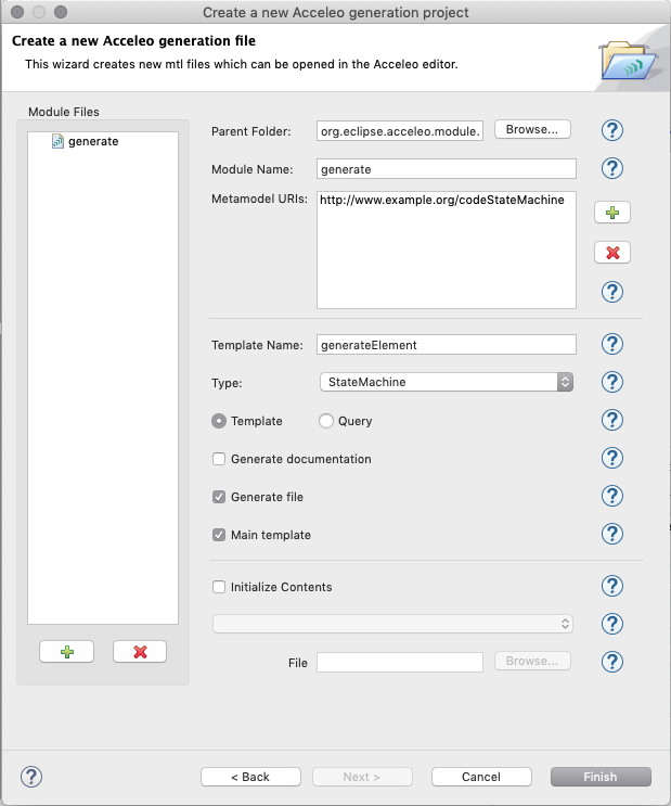 Il nous reste à générer le code pour exécuter notre automate. Nous allons pour cela utiliser une transformation M2T (Model to text) avec l'outil Acceleo.