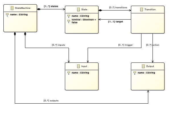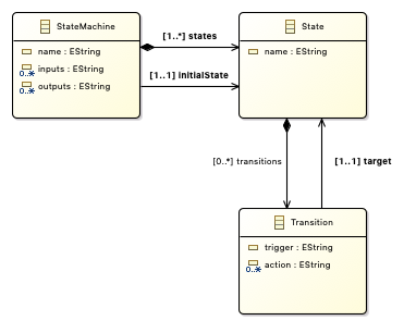 - StateMachine qui représente un automate et a un nom, des entrées, des sorties et des états