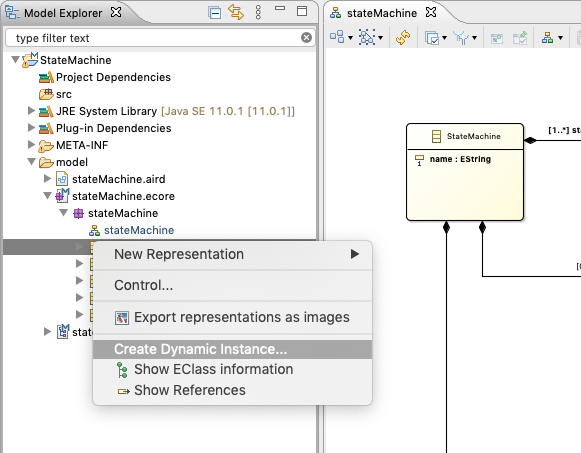 Vous pouvez enregistrer le fichier .xmi correspondant à la racine du projet StateMachine. Le modèle s'ouvre par défaut dans un éditeur qui n'est pas très agréable. Vous pouvez donc le fermer et rouvrir le fichier .xmi dans l'éditeur Sample Reflective Ecore Model Editor (menu Open With).