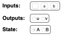 Pour vous aider à écrire la transformation, considérons l'automate suivant, dont l'état initial est A, et qui a pour événements d'entrée a et b, et pour actions u et v :