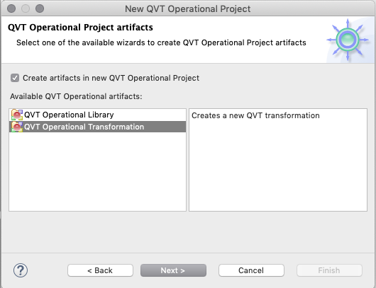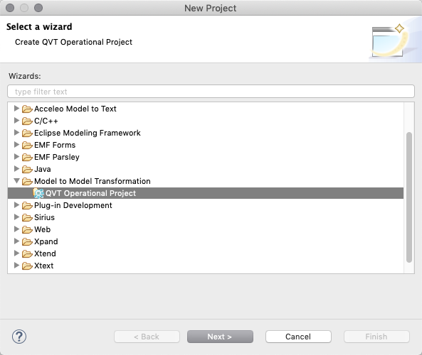 Nous allons donc créer un nouveau projet QVT Operational, en choisissant l'élément indiqué ci-dessous dans ''File > New > Project…' :