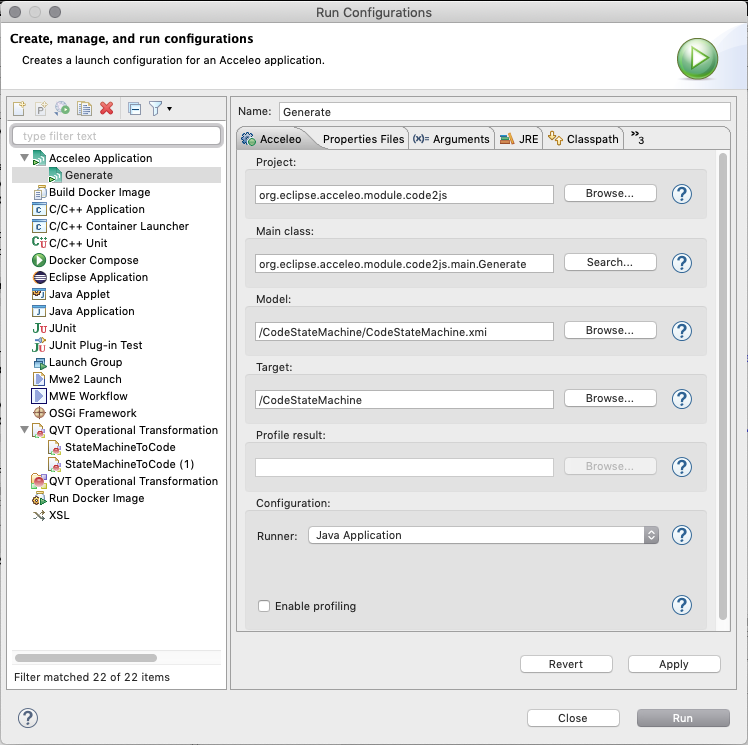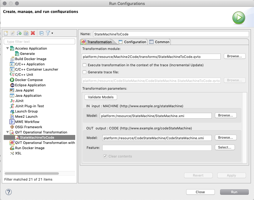 Pour exécuter cette transformation sur notre automate, il suffit de choisir Run As > Run Configurations… dans le menu contextuel du fichier .qvto, et de créer une configuration QVT Operational Transformation puis de renseigner les modèles source et cible dans le dialogue qui s'affiche :