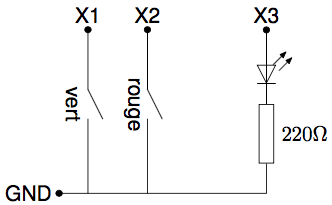 Vous pouvez maintenant écrire un programme qui teste indéfiniment le niveau des pattes X1 et X2, et qui allume la LED lorsqu'on appuie sur le bouton vert, et l'éteint lorsqu'on appuie sur le bouton rouge.