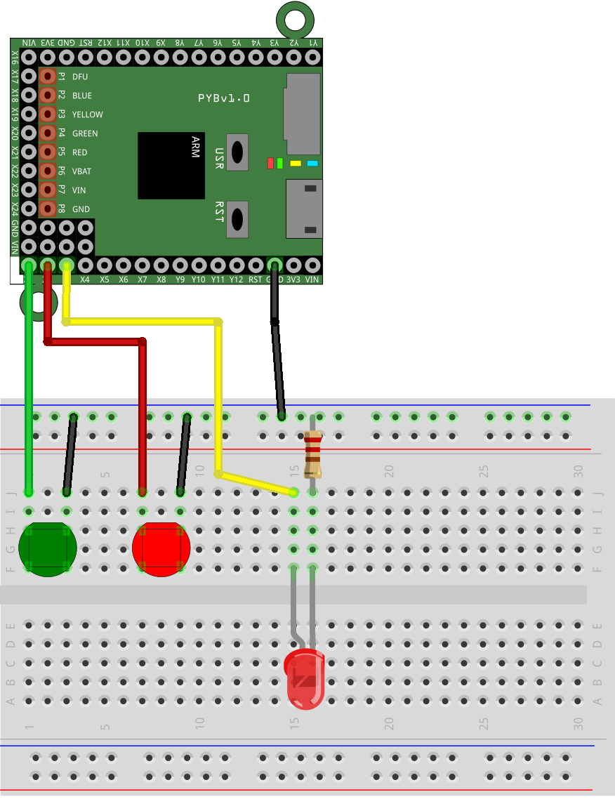 Nous utilisons la rangée de trous du haut, située le long de la ligne bleue et marquée du signe - pour la masse du montage, qui sera donc connectée à la patte GND de la pyboard. Connectez la patte libre (celle qui n'est pas connectée à la masse) du bouton vert sur la patte X1 de la pyboard, de même pour la patte libre du bouton rouge et la patte X2 de la pyboard. Connectez l'anode de la LED à la patte X3 de la pyboard, la cathode étant reliée à la masse à travers la résistance.