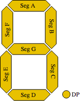 Le MAX7219 est capable de piloter des afficheurs comportant jusqu'à 8 chiffres comportant 7 segments et un point décimal, comme indiqué ci-contre. Dans ce cas, on place généralement dans chaque registre de donnée la valeur numérique que l'on souhaite afficher, et le MAX7219 doit alors décoder cette valeur pour allumer les segments adéquats. Par exemple, si un registre contient la valeur 1, il faut allumer les segments B et C. S'il contient la valeur 0, il faut allumer les segments A, B, C, D, E et F. C'est ce qui est fait quand le bit du registre Decode correspondant à un chiffre est à 1. Lorsqu'il est à 0, chaque bit du registre Digit pilote un segment (ou un point de notre matrice).