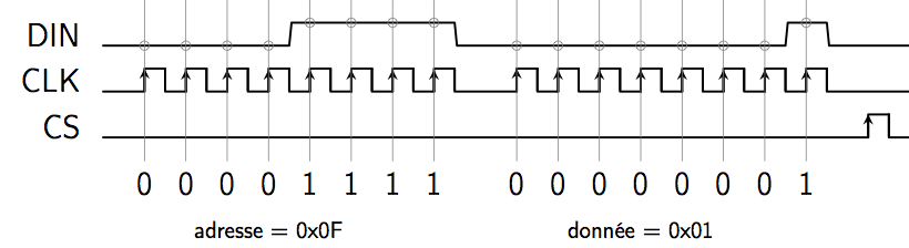 Afin d'écrire dans un registre du MAX7219, il faut lui transmettre 2 octets, le premier étant l'adresse du registre dans lequel on veut écrire, le second étant la donnée à charger dans ce registre. Pour que le MAX7219 prenne en compte les deux octets et charge la donnée dans le registre, il faut présenter un front montant sur le signal CS (Chip Select). Le chronogramme suivant indique comment mettre le MAX7219 en mode test en écrivant la valeur 1 dans le registre Display test qui se trouve à l'adresse 0x0F :