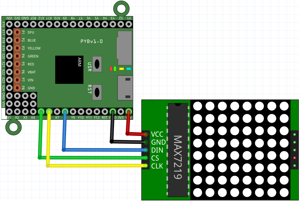 Le signal CLK de la matrice est connecté à la patte X6, le signal CS à la patte X5 et le signal DIN à la patte X8. L'alimentation (VCC) et la masse (GND) sont connectées aux pattes VIN et GND de la pyboard.