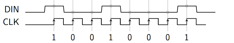La communication avec le MAX7219 se fait par une liaison série, c'est-à-dire que les données sont envoyées sur un seul fil, bit par bit. Il s'agit ici d'une liaison série synchrone, l'envoi de chaque bit étant indiqué par un front montant du signal d'horloge. Ainsi, le chronogramme suivant correspond à la transmission d'un octet (8 bits) de valeur 145 (128+16+1), DIN étant le signal de donnée et CLK le signal d'horloge :