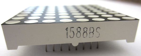 Pour contrôler individuellement ces 64 LED, il faudrait a priori 64 fils et une masse commune, ce qui ne serait pas très pratique. En observant le composant, on constate qu'il ne possède que 16 broches, dont les 8 premières apparaissent sur la photo ci-dessous :