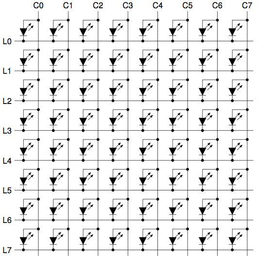 La solution à ce problème est de ne mettre à la masse qu'une seule ligne à la fois, et à alimenter les fils de colonne en fonction des LED que l'on souhaite allumer sur cette ligne. En traitant successivement les 8 lignes de cette façon, on allume successivement les LED que l'on souhaite sur chaque ligne, et si le changement de ligne se fait suffisamment rapidement, la persistance rétinienne donne l'illusion que toutes les LED souhaitées sont allumées en permanence. Il s'agit d'une forme de multiplexage temporel : on envoie successivement différentes valeurs sur les fils des colonnes, de manière synchronisée avec la mise à la masse des différents fils de ligne.