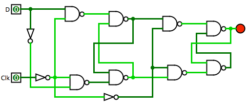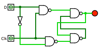 Les deux portes de droite constituent une bascule RS dont les entrées sont calculées par les trois portes de gauche à partir de D et Clk. On a {$S=Clk\wedge D$} et {$R=Clk\wedge \overline{D}$}. Ainsi, la bascule RS ne change d'état que si Clk vaut 1, et elle passe un 1 si D vaut 1, et à 0 si D vaut 0. On a donc bien un circuit qui enregistre la valeur de D quand Clk vaut 1, et qui la conserve quand Clk vaut 0.