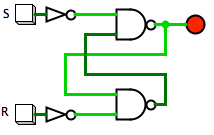 Dans le circuit ci-dessus, la sortie peut initialement prendre une valeur quelconque. En effet, lorsque les boutons R et S ne sont pas enfoncés, les entrées correspondantes des portes NAND sont à 1. Si la sortie vaut 1, l'entrée supérieure de la porte du bas est à 1, donc sa sortie est à 0, et l'entrée inférieure de la porte du haut est donc à 0, la sortie vaut donc 1. On a bien un état stable. Si la sortie vaut 0, l'entrée supérieure de la porte du bas vaut 0, donc sa sortie vaut 1, ainsi que l'entrée inférieure de la porte du haut. La sortie vaut donc 0, et on a un autre état stable.